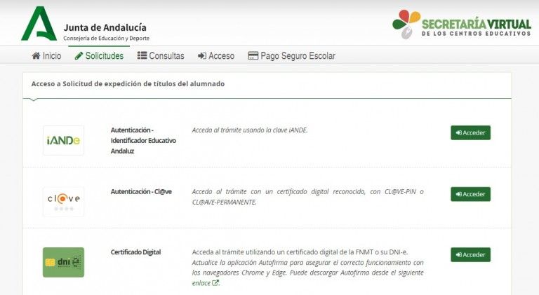 Para iniciar el trámite debes acceder a la Secretaría Virtual de la Consejería de Educación de la Junta de Andalucía y seleccionar la opción: «Solicitud de expedición de título del alumnado». Puedes acceder directamente desde este enlace. La identificación se hará mediante alguno de estos sistemas: