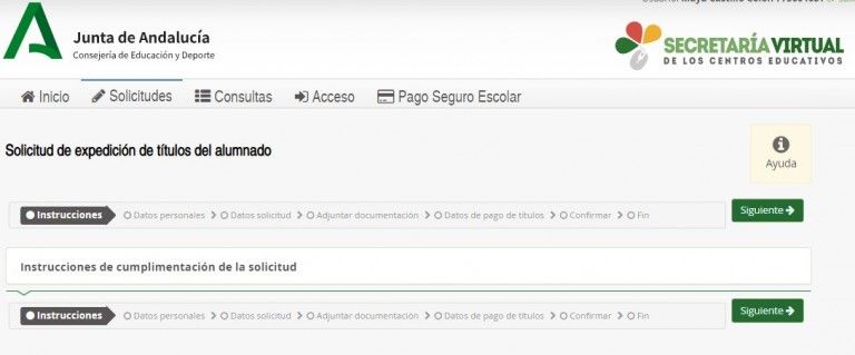 La solicitud del título se realiza de forma telemática a través de la Secretaría Virtual de los centros educativos de Andalucía. Una vez identificado/a debes aceptar las instrucciones pulsando en “Siguiente” y completar los datos que te va solicitando el formulario.
